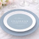 Elegant round wedding menu featuring a soft dusty blue background and modern minimalist typography.
