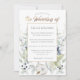 Fresh winter flowers in shades of dusty blue, sage green, white, cream, and greys wedding invitations. The text boxes are easy to personalize using a mix of modern and calligraphy fonts. The back of the card is dark dusty blue.