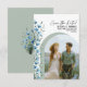 Let your friends and family know to save the date for your upcoming wedding with this beautiful card. Features a rustic boho chic design with country wildflowers in shades of dusty blue and sage green. Your photo is displayed in a beautiful arched frame and the title is written in elegant modern script lettering.
