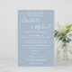 Elegant dusty blue signature script wedding weekend program featuring signature style names. Personalize with your wedding weekend details set in chic white lettering. Designed by Thisisnotme©