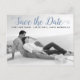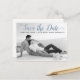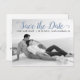Modern dusty blue script wedding Save the Date photo postcard. This contemporary typography Save the Date design features a black and white photo of the couple and the text "Save the Date" in a modern script font.