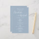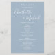Elegant dusty blue signature script wedding welcome program featuring signature style names. Personalize with your wedding day details in chic white lettering. Designed by Thisisnotme©