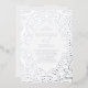 This is a perfect wedding invitation that feels royal and elegant with a pretty real silver foil, dusty blue colour (backside), floral lace frame design with leaves. Perfect for any season.