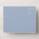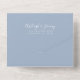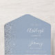 The left-hand edge of this elegant modern all-in-one wedding invitation and RSVP features a silver faux glitter border. The customizable text combines silver grey whimsical handwriting, copperplate and italic fonts on a dusty blue background. The return address appears on the outside flap and the reverse side of the detachable RSVP card in silver grey text on solid dusty blue. A QR code is included on the RSVP card for guests who would prefer to reply online.