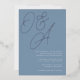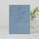 A beautiful typography based monogram wedding invitation featuring your initials in oversized silver foil script lettering at the top, in tone on tone shades for a watermark effect. Personalize with your wedding details in classic serif lettering aligned at the lower right. Our Dusty Blue colorway is an elegant mix of ethereal blues, with white and blue-grey lettering on a dusty medium blue background.