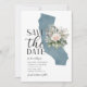 Elegant script California destination wedding save the date with a dusty blue floral state illustration.