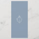 Above the text, there is a monogram in a vintage faux silver foil crest. The title "Menu" and the subtitles are written in caps. All text can be personalized and has a grey colour similar to the faux silver crest. The background is dusty blue. On the back, there is the same monogram in crest. The monogram is formed by the two initials separated by a thin line.