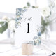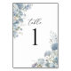 A dusty blue watercolor floral table number designed for elegant weddings.