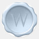Inside a dusty blue wax seal with irregular contour, there is a monogram initial that you can change (the default is W) that seems embossed. (It is not really embossed, the illusion of embossed is simulated in the artwork)