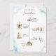Welcome your guests with this gorgeous card with elegant timeline on the front and welcoming message on the back. Timeline with watercolor icons in beautiful golden hues. Both front and back with delicate dusty blue watercolor stains with dainty gold speckles. Modern hand written calligraphy details in gold. Ability to "grab and move" timeline icon images to different order to suit your event by selecting customize further.