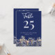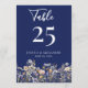 This Dusty Blue Watercolor Wildflowers Elegant Script Navy Wedding 5 x 7 Table Number showcases delicate watercolor wildflowers in dusty blue, purple, and yellow on a navy blue background, complemented by contemporary typography and script calligraphy in white. The formal design and wording will add a touch of elegance to your wedding celebration.