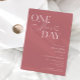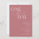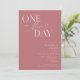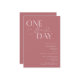 Minimalist wedding rehearsal dinner invitation featuring typography text that says "one more day." The background is dusty pink.