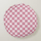 Pink and white chequerboard pattern with evenly spaced squares. The design is simple, creating a playful and retro feel.