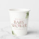 An elegant baby shower paper cup featuring chic dusty rose pink typography and pretty botanical greenery foliage. Designed by Thisisnotme©