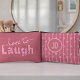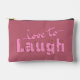 This cheerful pink lettering that says love to laugh, accented by little floral details that are hand drawn, is cute fun way to carry your makeup. The back matches perfectly with vertical pink floral stripes on a rich dusty rose pink background, plus a circle in the center where you can add your own initials. It’s a customizable makeup bag that works just as well for stashing school supplies, travel must‑haves, or everyday essentials. The zipper keeps everything secure, and the design makes it feel personal and fun.