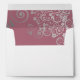 This beautiful envelope features a dusty rose or mauve coloured inside flap with lacy silver faux foil filigree. The back flap has a printed address. Perfect for adding extra style and class to your wedding invitations.