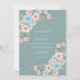 This design features a serene dusty teal background adorned with soft pink cherry blossoms and light blue roses. The watercolor aesthetic creates a romantic and airy mood perfect for a springtime theme. Elegant sage green leaves weave through the floral clusters, adding a touch of nature-inspired beauty.
