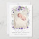 Carte de faire-part photo florale en forme de portrait de naissance dans les tons pastel avec fleurs d'anémones, eucalyptus, ranunculus et succulents.