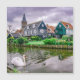 Painting of traditional wooden fishing houses, canal and swan in Marken, Netherlands. View of canal, bridge and traditional fishing houses in waterland village. Traditional Holland symbols..