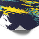 An energetic abstract artwork featuring bold intersecting lines and sharp brush strokes in deep navy, vibrant yellow, and turquoise against a clean white background. The composition conveys speed, movement, and explosive energy, blending chaotic spontaneity with striking visual balance.
