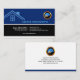 A simple design with a dual tone colour background. The top blue portion has an abstract blue roof design at the left wall ; its business name is just beside it. Your optional faux gold icon logo is northwards of this. A striking white line demarcates the upper section against the lower black portion. At the latter, all your card's information are stored here. A small vertical white line separates your name and job title on the left against your contact details at the opposite end. Each detail is allocated a bullet point. Near the floor of the card, you have a slogan tagline. The design ends off with a white border at the card's floor.