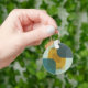 A modern, abstract geometric poster design featuring overlapping translucent shapes. The composition is divided into four quadrants with textured, muted background colors (soft teal, light sage, dark charcoal/slate). Central to the design are a large, vibrant mustard yellow curved shape and several partially visible, translucent teal/grey circles and rectangles. The artwork is characterized by its sharp lines, clean edges, and contemporary color palette, creating a sense of depth and dynamic movement through the interplay of transparency and opaque forms.