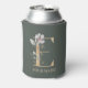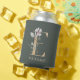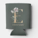 Letter E monogram floral. Letter E in golden brown texture accented with green watercolor compound leaves, flower blossoms and gold dust. Personalized with name in matching font.
