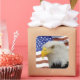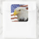 An image of the head of a bald eagle over an American flag waving in a breeze.