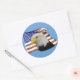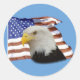 An image of the head of a bald eagle over an American flag waving in a breeze.
