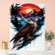 Digital illustration of a red-tailed hawk perched on a blue splattered rock. The hawk has detailed brown and white feathers, yellow talons, and a sharp yellow beak. Behind it, a vibrant sunset with a red-orange sky, silhouetted pine trees, and snow-capped mountains. The background features dynamic brush strokes and splatters, blending realism with abstract art styles. The overall color palette includes rich browns, whites, blues, and reds.
