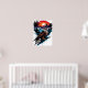 Digital illustration of a red-tailed hawk perched on a blue splattered rock. The hawk has detailed brown and white feathers, yellow talons, and a sharp yellow beak. Behind it, a vibrant sunset with a red-orange sky, silhouetted pine trees, and snow-capped mountains. The background features dynamic brush strokes and splatters, blending realism with abstract art styles. The overall color palette includes rich browns, whites, blues, and reds.