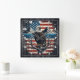 A majestic eagle stands on a tree branch, set against a background featuring mountains and the American flag.