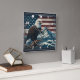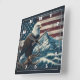 A majestic eagle stands on a branch, overlooking a rocky landscape with mountains and waves, all set against a backdrop of the American flag.