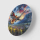 A beautiful eagle soars above a still sleepy town as the suns comes up over the mountain.