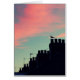 A photo of rooftop chimneys, and aerials with some birds silhouetted against a vivid early dawn sky in greenish blue tones with pink cloud.