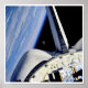 The moon is framed between the Orbiter's OMS pod and the Earth limb over the Atlantic Ocean as seen from the aft windows onboard Discovery on mission STS-95.