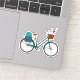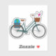 This contour sticker features a hand-drawn illustration by Melissa Balmer of a teal city bike with a globe (North America) in its panniers and a pink flying heart in its basket.