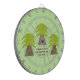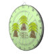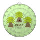 This awesome dart board features a graphic image of three trees that resemble palm trees with large green leafy fronds and a sturdy brown tree trunk. There is a message in brown text to look like soil under the trees. The message says Happy Earth Day.