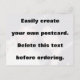 Easily create your own photo postcard. Change image with your own photo and click on Customize to resize image and choose font size and colour and make your unique postcard. Horizontal orientation but you can easily make it vertical orientation. Don't forget to delete the large text before ordering.