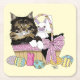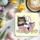 Cute tabby long hair kitten sitting in an Easter Basket with a pink bow and a stuffed Easter Bunny. Easter Eggs all around the basket.