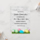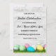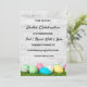 A delightful Easter Brunch and Egg Hunt invitation with coloured easter eggs on green grass on a chalk grey background