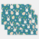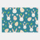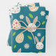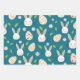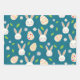 Easter Bunnies with Eggs and Flowers on Blue Wrapping Paper Sheet