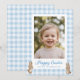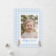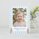 Celebrate Easter with a sweet and personal touch with this Happy Easter photo card, featuring a soft blue watercolor gingham design and adorable baby bunny accents. The front includes a large photo frame for your favorite picture, an adjustable “Happy Easter” greeting, and a customizable sender line, making it a lovely way to send a personalized Easter message to family and friends.