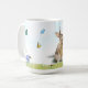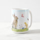 The cutest Easter mug with a furry brown bunny with a lady bug on his head, baby chick, purple crocus, clover flowers and butterflies all in a grassy, Spring meadow with blue sky. Personalize with your name or greeting.