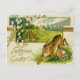 This spring send someone an Easter greeting! This vintage print depicts an Easter bunnies, coloured Easter eggs, a church, and cotton.