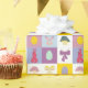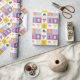 Cute and festive Easter wrapping paper with colourful chequered pattern, Easter eggs, bunnies, mushroom and bows.