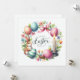 This image is an Easter-themed illustration that features a bunny holding a striped Easter egg, sitting amidst a wreath of colourful flowers, greenery, and decorated Easter eggs. A pink bow adorns the top of the wreath, adding a celebratory touch. A lit candle on the right side complements the cozy, festive atmosphere. In the centre, the text "Happy Easter" is displayed in elegant, flowing typography.