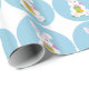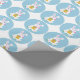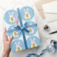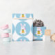 A cute Easter Bunny wearing a pink bow ribbon ever so happy holding on Easter Egg decorated in Spring colours filled with candy sitting on a patch of green grass with a robins egg blue circle. Use this to wrap a gift for a little or big girl or boy or a family or friend to wish them a Happy Easter.