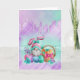 Easter Bunny Gnome with pink bunny ears sitting in spring flowers with decorated eggs and a wicker basket of carrots set on a watercolor teal and purple plaid background with pastel candy icing drips.
