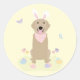A cute illustration of a golden retriever dog wearing bunny ears and a cute Easter bandana. Surrounded by decorated Easter eggs, spring flowers and butterflies.